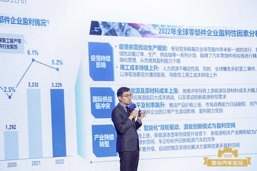 袁文博介绍,全球汽车零部件营收规模在复苏,2022年全球百强企业整体营收同比增长16%;盈利能力有波动,汽车零部件供应商总体利润率为5.2%。而中国汽车零部件营业规模增长有所放缓,实现了5%的总体增长率;整体利润规模维持稳定增长,2022年行业平均利润率为6%。