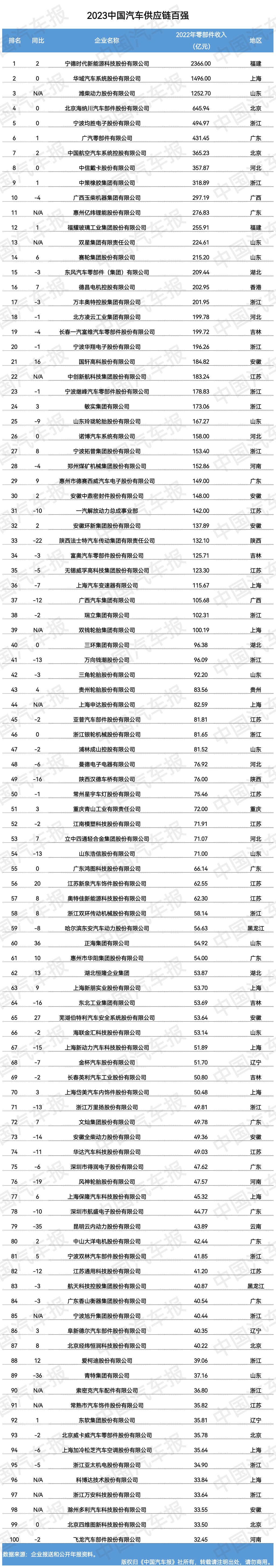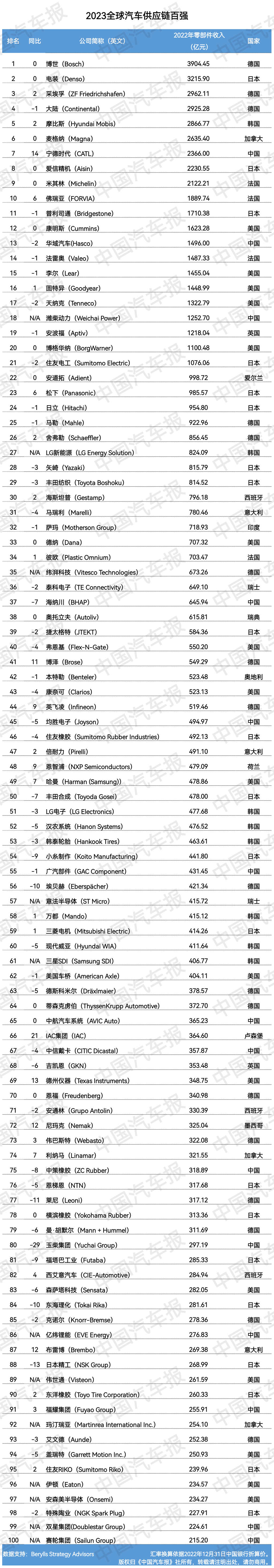 根据2023年全球汽车供应链百强(简称“全球百强”)企业营收数据来看,排在前五位的企业分别是博世、电装、采埃孚、大陆和摩比斯。全球增幅前三位的企业分别为,IAC集团(增幅21位),宁德时代(增幅14位),德州仪器(增幅13位)。宁德时代也由去年的21位提升到今年的第7位,是今年进入全球百强前十的唯一中国企业。