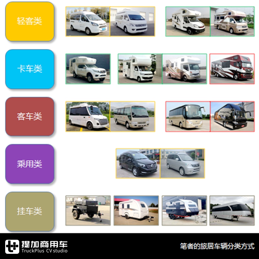 关于旅居车辆的产品分类,笔者依据汽车结构将其分为五种:其一是轻客类,也是旅居车里份额最大的产品种类,具体包括客厢一体式的VAN车型,房车业俗称自行式B型;以及“轻客驾驶室+轻卡式底盘”的CAB车型,也就是轻客的底盘车,俗称自行式C型。其二的卡车类很好理解,包括微卡、轻卡,以及名为多用途货车、实际上限3.5吨的皮卡,对应自行式C型;而车长超过6米的中重卡属于自行式A型;另近年流行的重卡级越野房车因属于特殊结构而不做单独划分。其三的客车类相对少见,主要是中巴类,以骨架车身为主要特征,包括考斯特或长头结构(校车样式),对应自行式B型;以及更罕见的中客或大客,对应自行式A型。其四则是乘用类,主要指的是MPV等小型商务车或露营车、却以旅居车名义申报的产品,对应自行式B型,目前已不多见。最后则是挂车类,包括中置轴、鹅颈挂车等,对应拖挂式A、B、C、D型,至于更特殊的背驮式房车也划入其中,虽这些车辆不在笔者的市场篇中体现,但在产品篇里会有涉及。