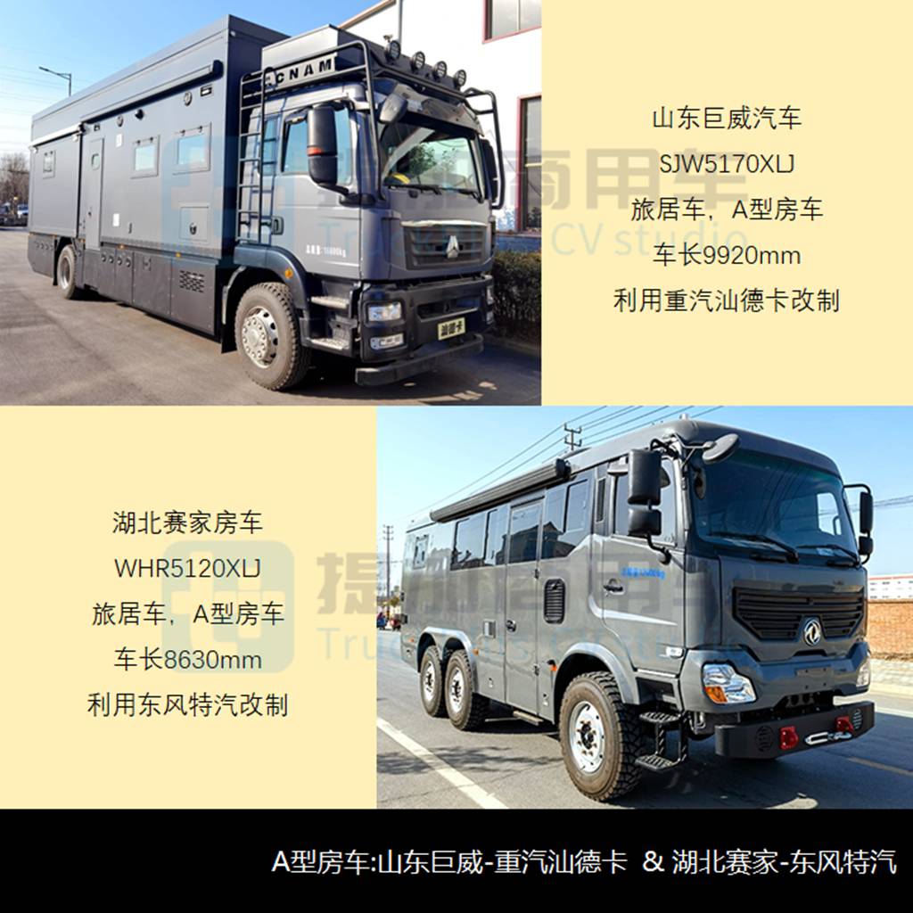- 湖北赛家房车申报了WHR5120XLJ旅居车,利用东风特汽EQ6820ZT6D整车改制,车长8630mm、轴距3475+1250mm,特种客车的三轴6×6型置,GVW=12吨,前9片、后12片板簧悬挂,额定载客9人,搭载东风康明斯4.5L、220马力柴油机,最高车速100km/h。该车采用东风天龙VL前围风格、保留副驾驶门,客舱前部为座椅区,右侧门后布置厨具,并利用封闭式物理隔断对卧具和独立卫生设施进行功能分区,体现出A型房车的大空间优势。