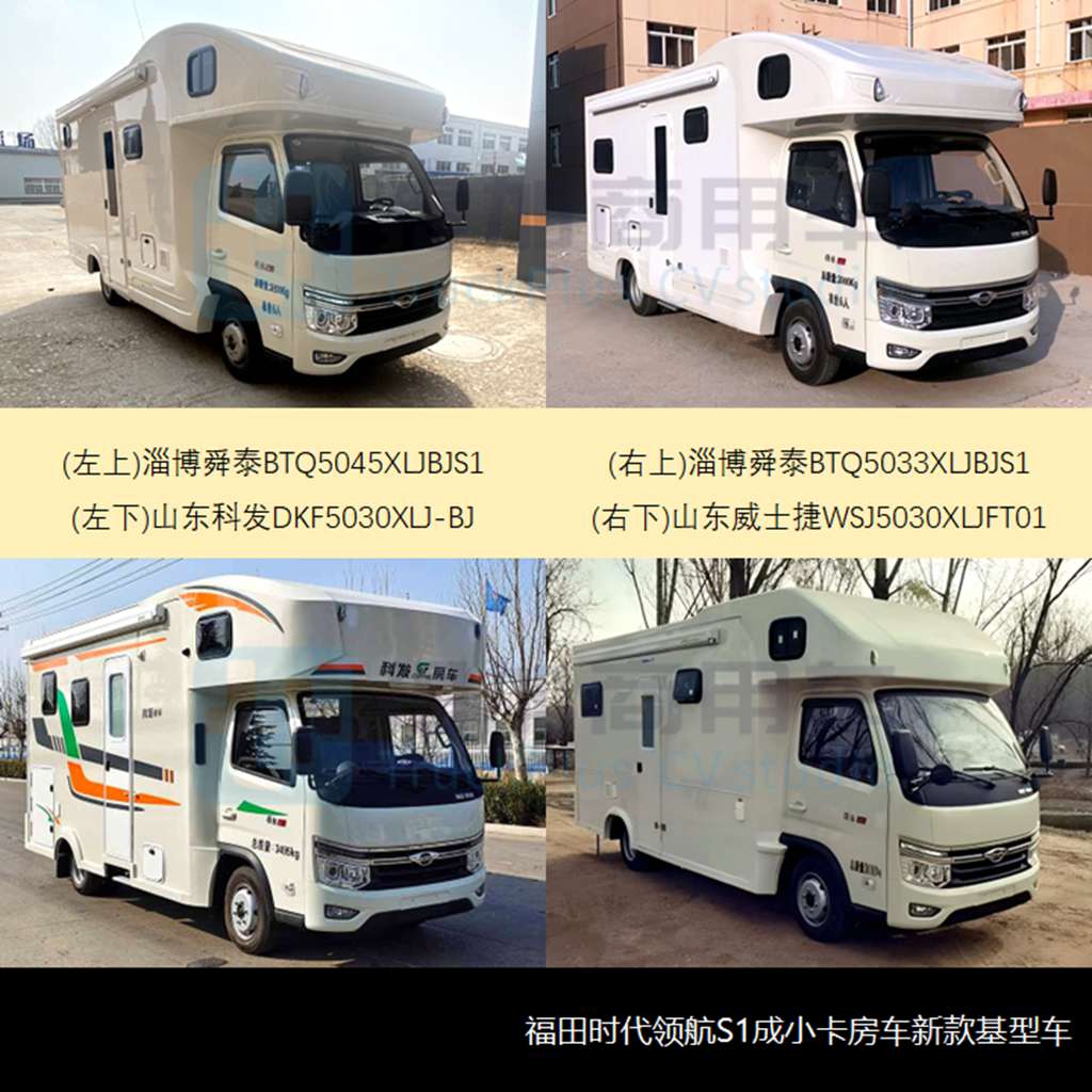 随着小卡类房车的灵光乍现,各种3-4吨级新品重新走红,本批更是出现了新款底盘基型车——北汽福田时代领航S1系列小卡,受到山东房车企业的青睐,包括淄博舜泰BTQ两款、山东科发DKF和山东威士捷WSJ各一款,搭载长城天津哈弗1.5L、136马力汽油机或安徽全柴2.0L、122马力柴油机,有GVW=3/3.5/3.8吨三种规格,前/后板簧悬挂,后双胎驱动,同为C型房车、且额头方舱模具有造型相似之处。目前涌入房车圈的小卡底盘车大量出现,诸如前述的五菱荣光小卡、上汽跃进福星系列,以及重庆长安跨越王X1和跨越者D5等,连同已经巩固行业地位的福田祥菱M系们,为房车行业提供了别样选择。
