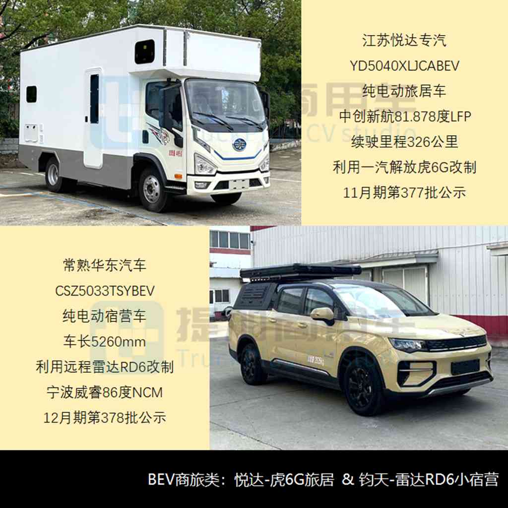 - 由于当前的动力电池技术“相对”受限,对于看重通行自由度的旅居车而言极少涉及,此前行业也仅有利用万宝系白车身改制的BEV欧系轻客是唯二的纯电动产品(原北汽常州和杭州中汽-成都中植)。11月期第377批公示,江苏悦达专汽申报了YD5040XLJCABEV纯电动旅居车,成为行业首款C型大额头、卡车底盘的BEV旅居产品,更具开创性的划时代意义。该车利用一汽解放青岛新款虎6G二类底盘改制,经典后横床布局方案、额定载客6人(前2+后4),搭载中创新航81.878度LFP动力电池,上海中科深江120kW电驱系统,最高100km/h,续驶326公里基本满足大部分省内或少部分跨省自驾游,但也明显有赖于出行目的地的充电设施普及情况。
