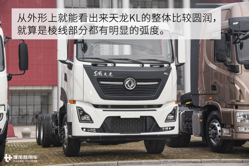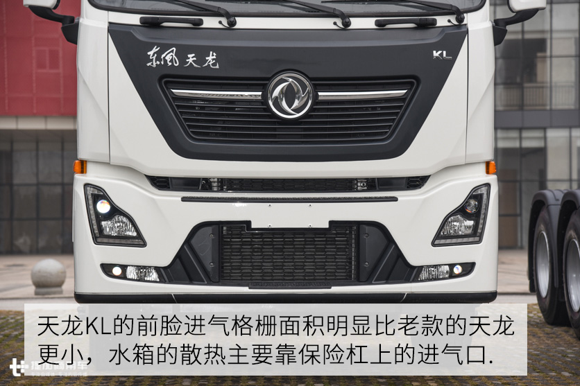 作为天龙的换代产品,天龙KL在外观、内饰及底盘各方面都有了明显的升级,特别是驾驶室的造型更趋向于低风阻设计。从外形上就能看出来天龙KL的整体比较圆润,就算是棱线部分都有明显的弧度。在这种以低风阻系数优先的设计理念下,天龙KL的前脸进气格栅面积明显比老款的天龙更小,水箱的散热主要靠保险杠上的进气口。