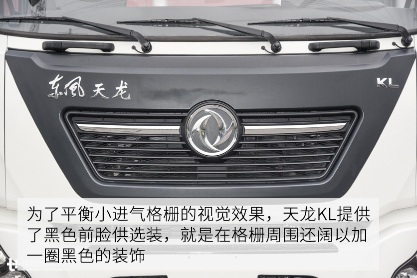 为了平衡小进气格栅的视觉效果,天龙KL提供了黑色前脸供选装,就是在格栅周围还可以加一圈黑色的装饰,这辆天龙KL就是加了黑色前脸,视觉效果确实提升了很多。