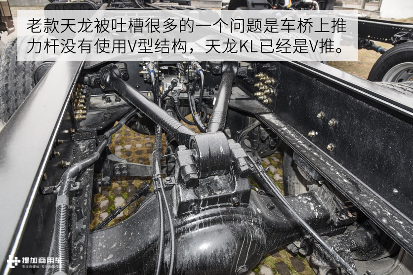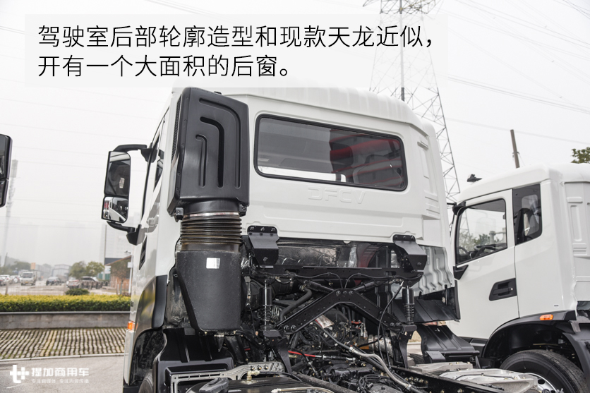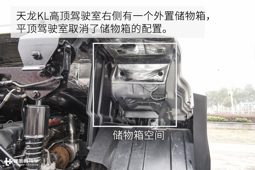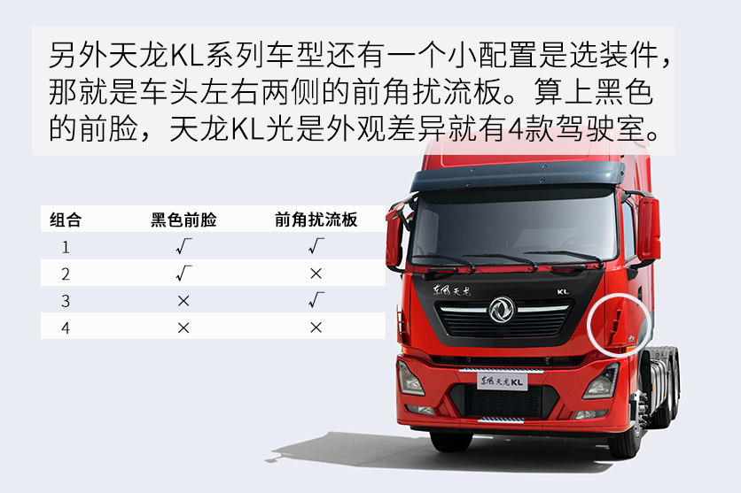 另外天龙KL系列车型还有一个小配置是选装件,那就是车头左右两侧的前角扰流板。算上黑色的前脸,天龙KL光是外观差异就有4款驾驶室。