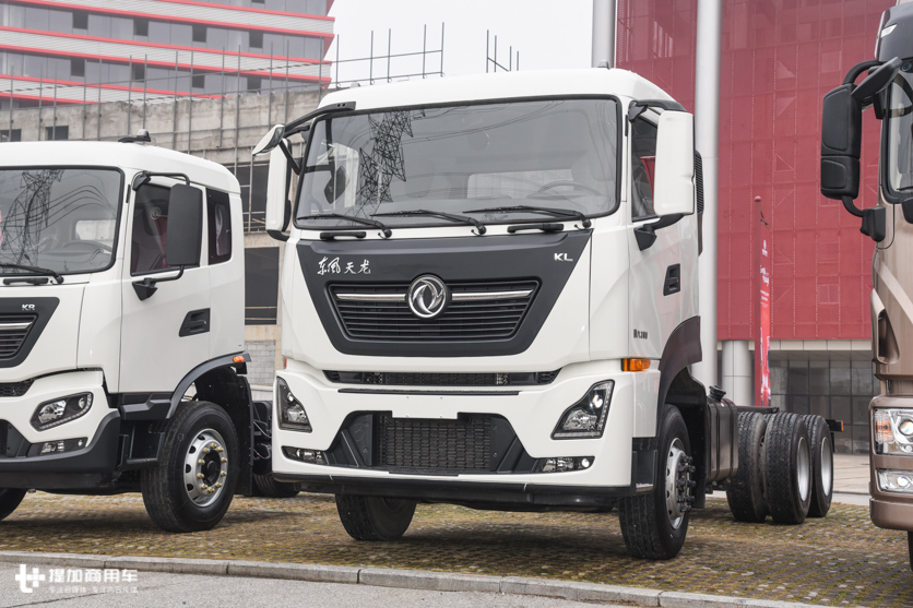 匹配300马力的国六发动机,最低自重8.2吨,天龙KL 6x4载货车底盘实拍