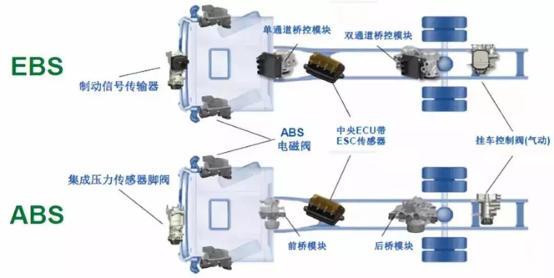 该系统是在防抱死系统(ABS)与防侧滑(ESP)的基础上升级而成的控制系统。其主要作用是减少了制动系统的响应时间和减压时间,实现整车电子制动力分配控制、制动帮助功能、缓速器控制、主挂协调一致性、减速度控制、摩擦片磨损控制等六大功能提高主挂车的匹配,提升列车安全性。