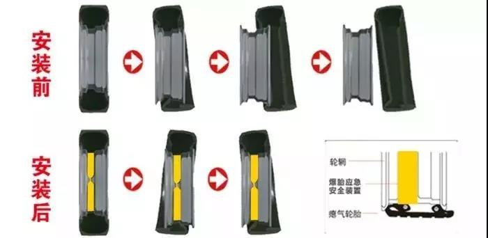 爆胎后防止轮胎与轮辋脱离,轮胎得到支撑,不会发生轮胎内缩导致轮辋直接着地,避免方向失控。
