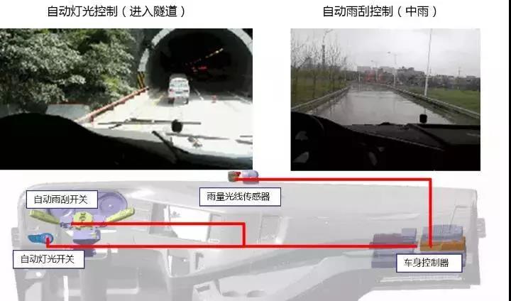 基于光线雨量传感器,将光线强度和雨量大小信息提供给车身控制器(BCM)自动控制灯光和雨刮动作,减少驾驶员的操作,提高驾驶舒适性和车辆自动化程度。