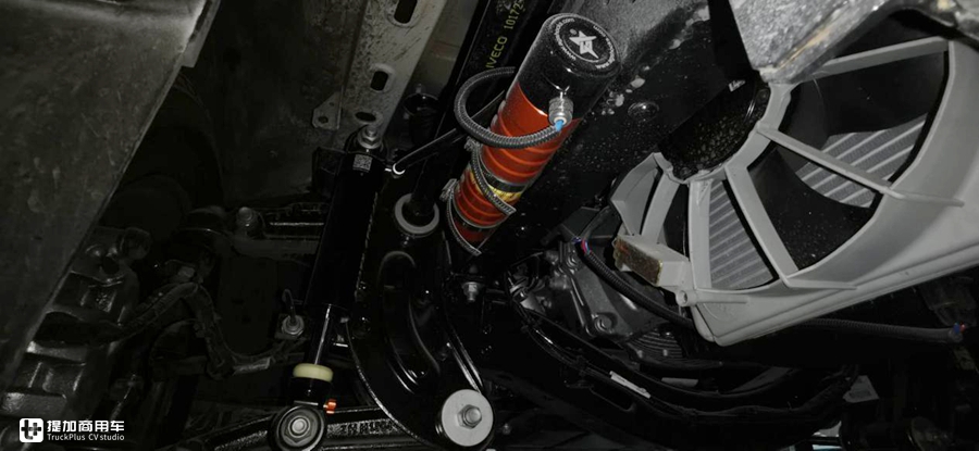 原厂前转向桥采用扭杆弹簧独立悬架,具备稳定可靠结构简单节省空间的特点,后驱动桥则采用钢板弹簧+液压筒非独立悬架,在此基础上改装厂在前后桥均加装了电控可调氮气减震系统,使得车辆操控性更好,侧支撑力更强,同时在极端情况下比空气悬挂稳定。制动方面,采用抗热衰退性更好的Power Plus通风盘制动系统,后制动器采用行驻一体卡钳,具备驻车间隙自动调整功能,全系标配BOSCH 9.0版本ABS刹车防抱死系统,配合EBD电子制动力分配系统,能避免在紧急刹车时车辆失控,令整车制动效率提升27%。TPMS主动胎压预警系统对轮胎压力、温度实施主动监控。