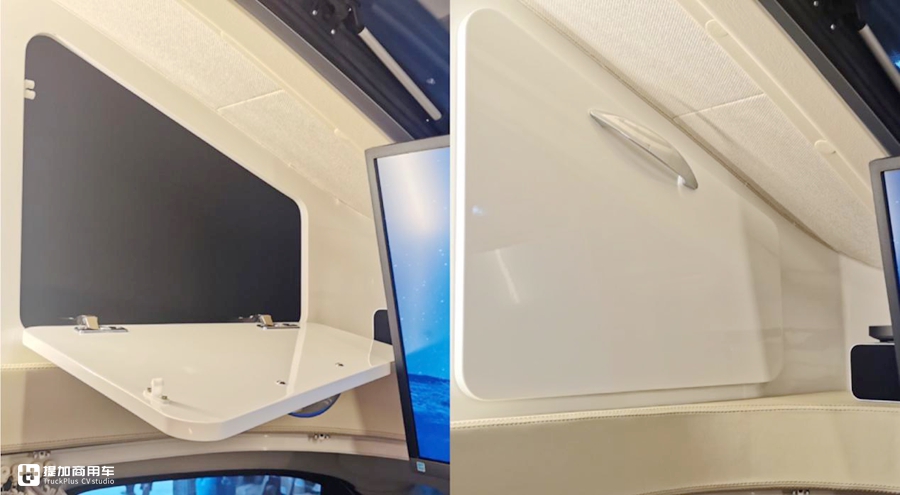 得益于小额头的设计,额头两侧设置了两个带锁止机构的储物柜,中部是一台34寸的三星4K液晶显示屏背部则有与显示屏配套的小米盒子和小米音响,对于喜欢看电影的人来说这是个不错的配置,整车的DSP八路功放,低音炮,前主动两分频加上A柱高音倒模,对于音乐发烧友而言内心会不会引起大幅波动呢。显示器下方还有一条隐私帘轨道,夜晚休息时可将绑在一侧的隐私帘往中间拉。网络科技高速发展的今天,我们对网络已经产生了超高依赖,对此该车配有4G华为315无线路由器。小额头中间还有一个大天窗,弧度与额头完美融合,不会增加风阻的同时也增加了车内采光,夜晚打开天窗便是漫天星空。